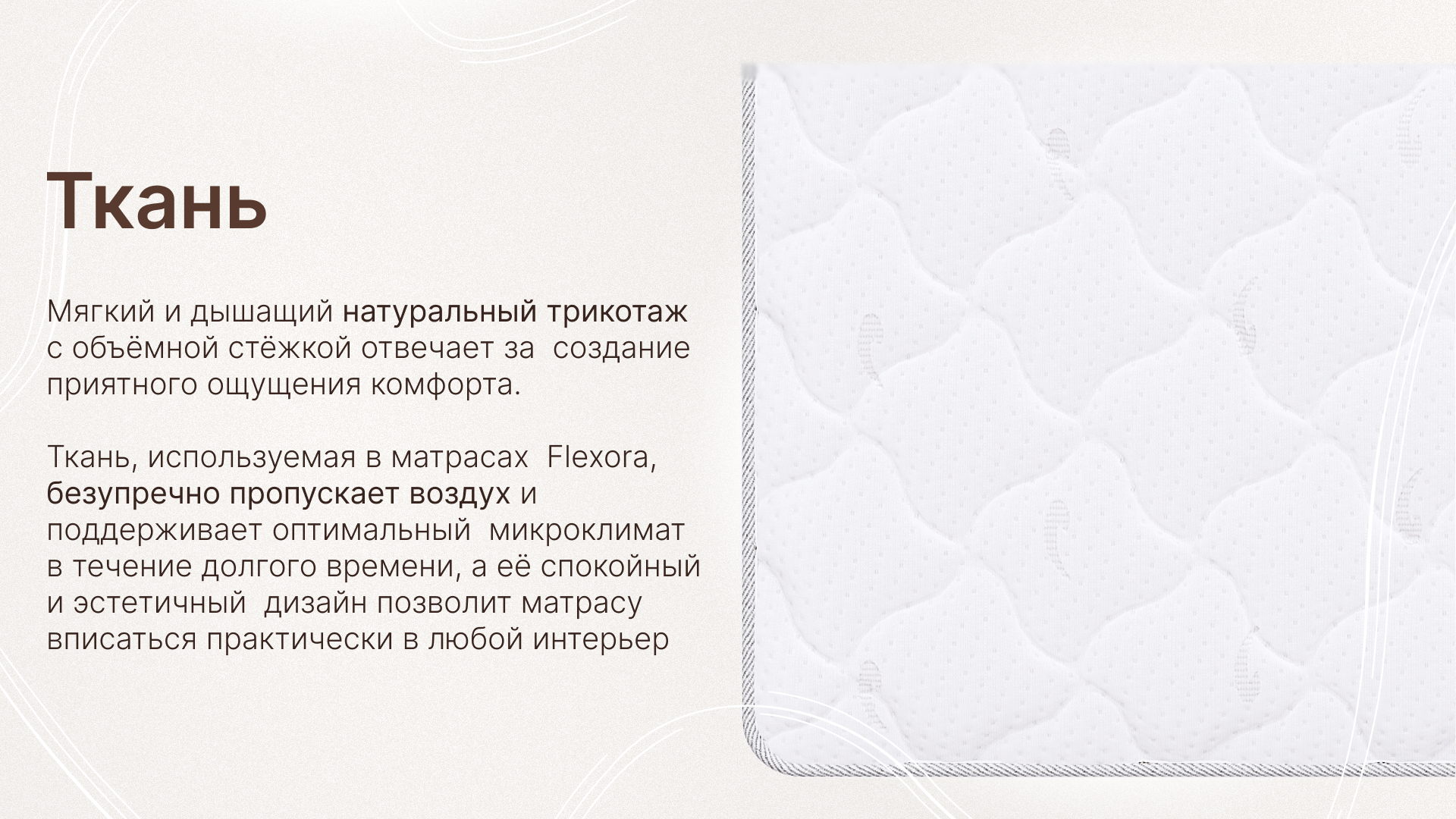 Бренд Flexora в первую очередь нацелен на Ваши пожелания. Наши матрасы отлично встраиваются в любой интерьер, подходят взрослым и детям. Благодаря ряду технологических решений, матрасы Flexora обладают сниженной передачей движения, что позволяет спать на матрасах парам, в том числе с большой разницей в весе, не боясь потревожить сон партнёра.